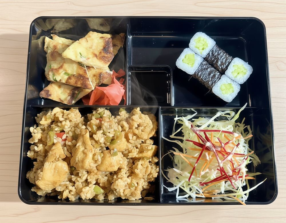 Рис с курицей в "Терияки" соусе, салат "Кацу", маки с огурцом, темпура овощные, имбирь.