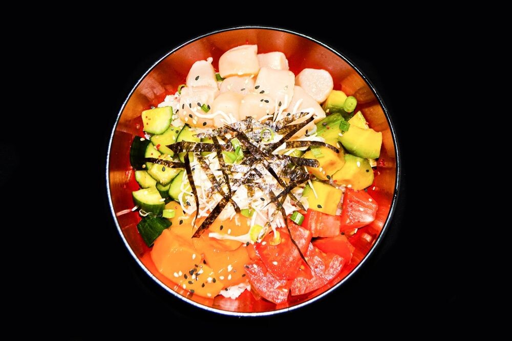 Гребешок, огурец, помидор, авокадо, манго, капуста, нори, рис