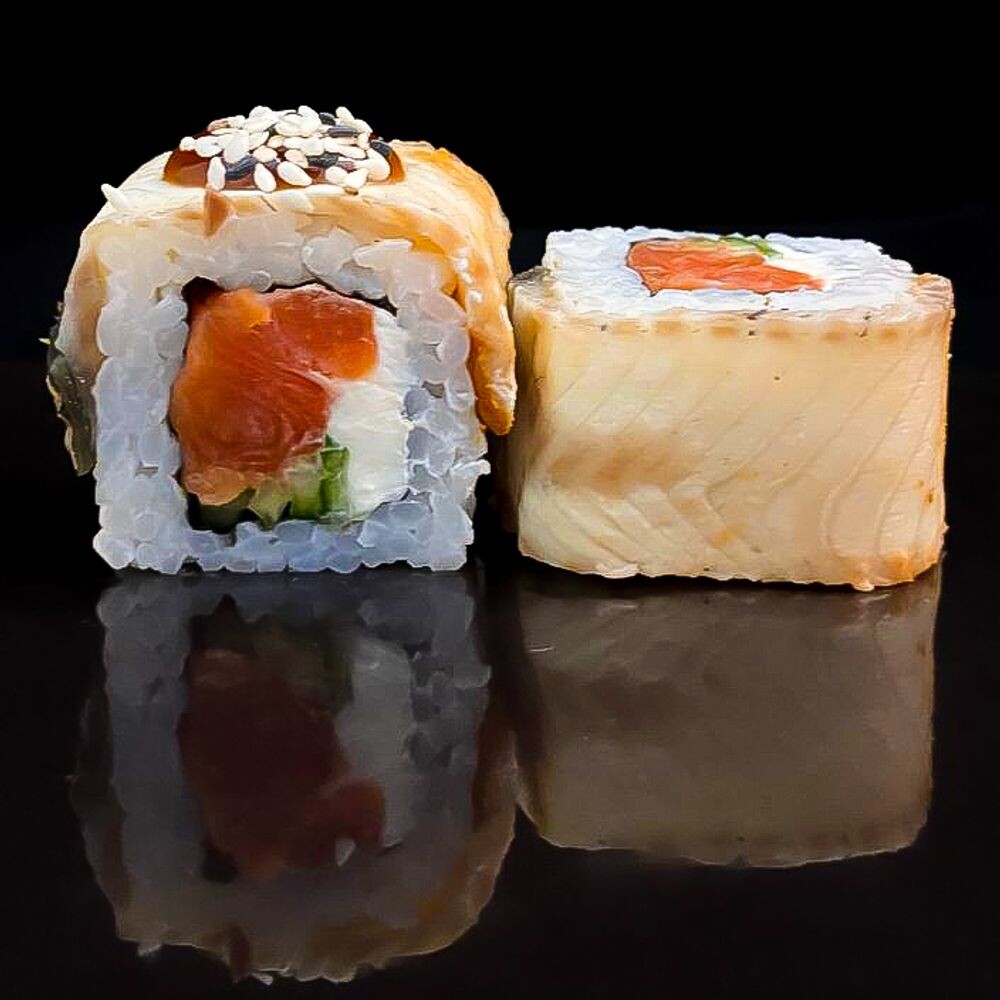 Рис, семга, угорь, сыр творожный, огурец, соус «Унаги»