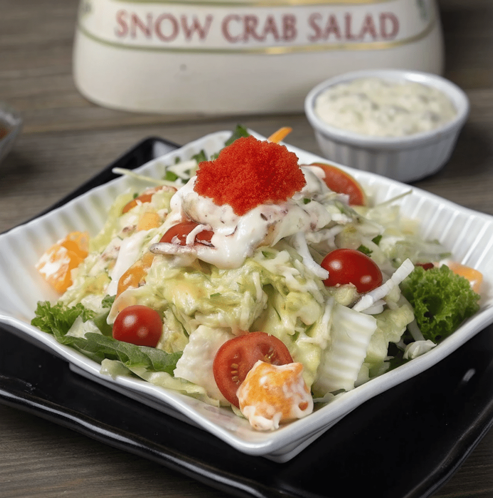 Снежный краб, салат "Айсберг", огурец, помидор черри, майонез, соус белый, тобико.