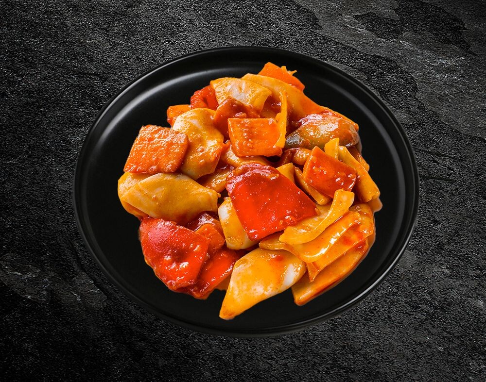 Кальмар, овощи, острый соус.
