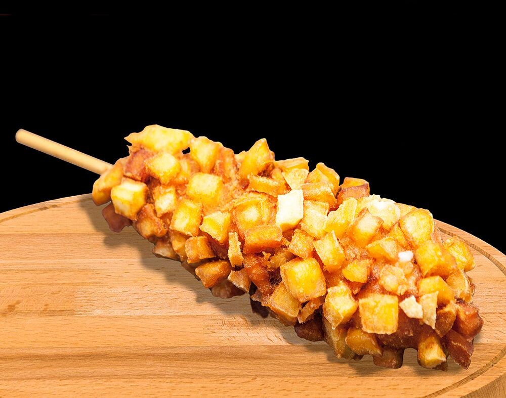 Сосиска в воздушном тесте с сыром и картошкой фри на палочке, обжаренная во фритюре.