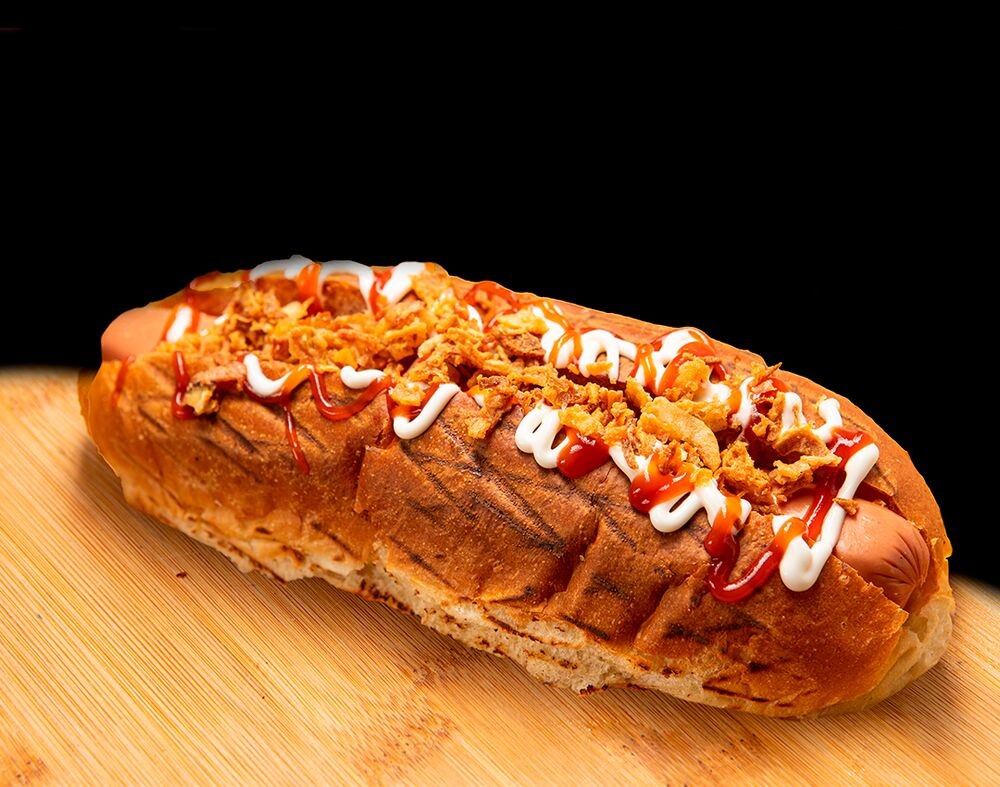Булка, сосиска , кетчуп, майонез, лук жареный.