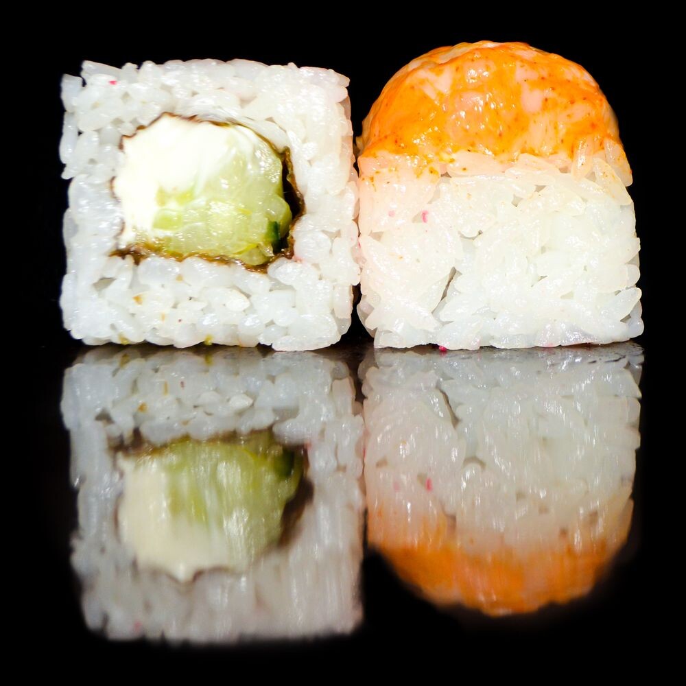Рис, гребешок, соус «Спайс», сыр творожный, омлет, огурец, соус «Унаги»
