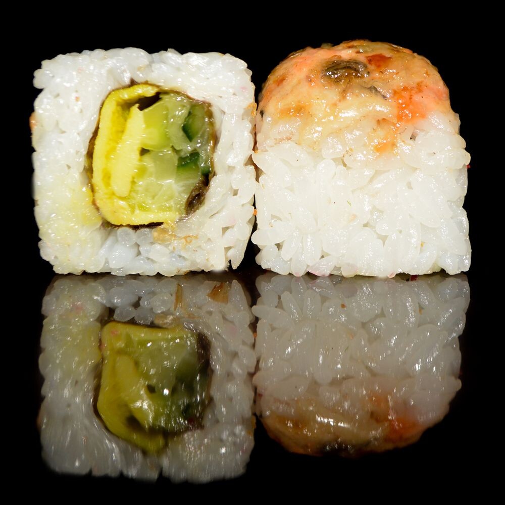 Рис, огурец, сыр творожный, омлет, семга, угорь, сыр «Моцарелла», соус «Унаги»