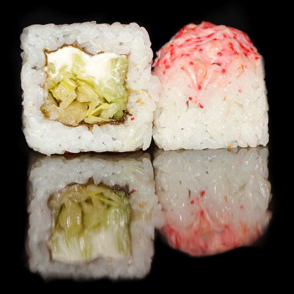 Рис, огурец, омлет, сыр творожный, креветка, краб, тобико, сыр «Моцарелла», соус «Унаги»