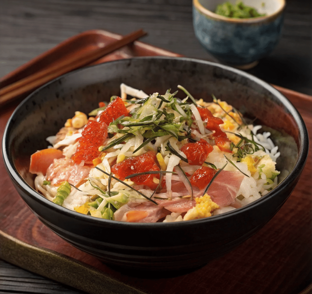 Тунец, семга, гребешок, снежный краб, тобико, омлет, рис, капуста, нори, зеленый лук, сливочное масло.