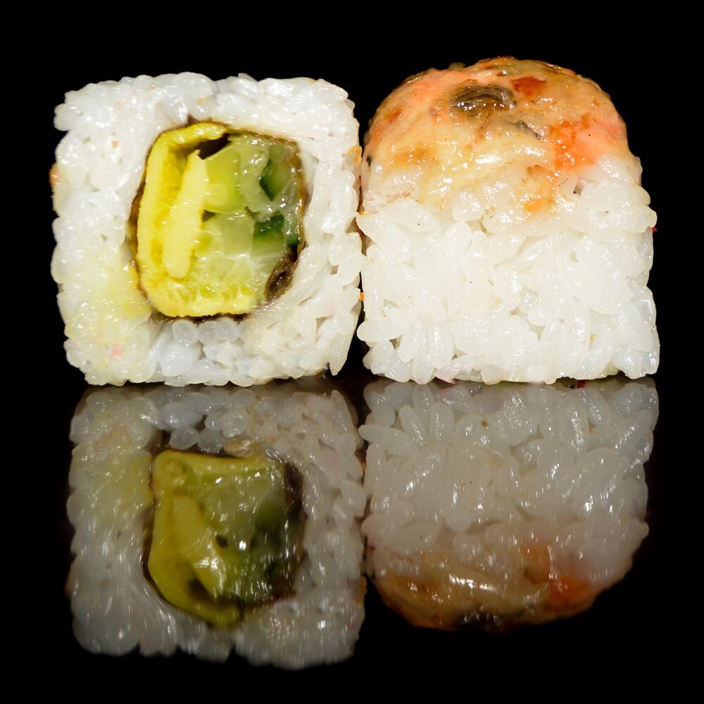 Рис, омлет, огурец, сыр творожный, креветка, угорь, сыр «Моцарелла», майонез, соус «Унаги»