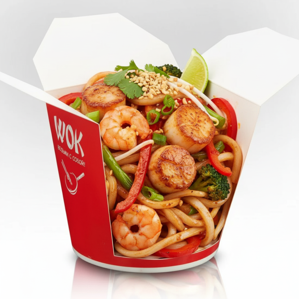 Креветка, гребешок, лапша удон, острый соус, соус пад-тай, овощи